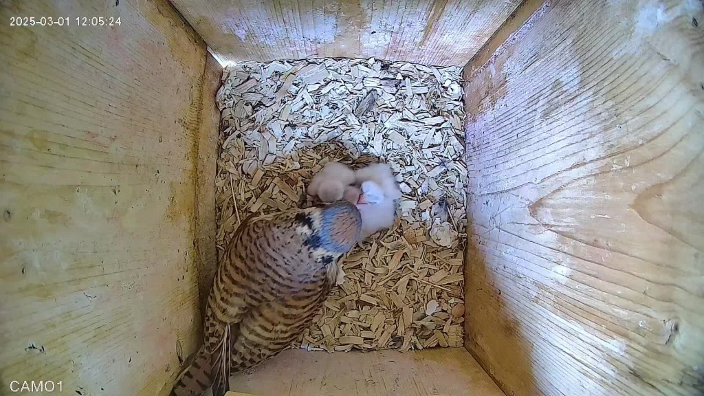 Today’s check of the nest box camera revealed at least four newly hatched chicks! The videos below show the female leaving the box briefly to take delivery of a lizard from her mate, revealing at least four hatchlings.